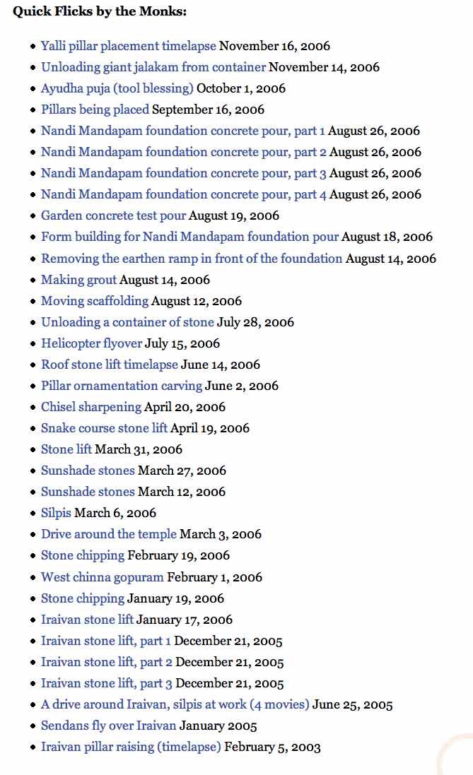 The black stone is much harder too, so there was extra effort going on as the giant stones were shaped. Plus, the shards which break off are much sharper, almost knife-like, and can cut the arm of the sculptor if he is not cautious. There are four Tara pillars in Iraivan temple, at the center. Each has three ieces, so you will see many blocks in the video. They are deeply fluted, as the video shows toward the end. This kind of sculpting is no longer done in India with granite. It is just too hard to achieve. But as you will see, worth the effort to bring this elegance into the 21st century. Here is our movie of the Tara pillars being carved today.