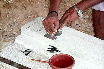 Something new was heard at Iraivan site today. Instead of the chink-chink-chink of the silpi's chisels on the white stone, we heard, for the first time, the kling-kling-kling sound, like that of a bell. The silpi's are working on the Tara pillars which are made of black stone, not white like the rest of the temple. The sound is so different, all were smiling and we were asked to capture it for you to hear. The first part of this video shows two clips, one of white stone being carved, one of black. See if you can discern the difference.
