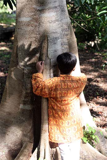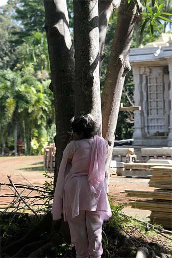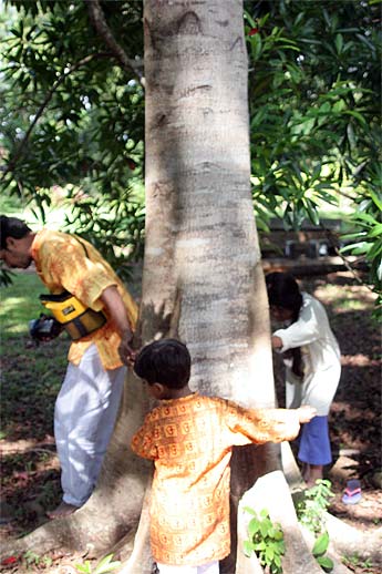 This is the Jodhpurkar family from Virgina. Jeetendra, his wife Madhavi, daughter Mohini and son Kanha. It was Kanha's 6th birthday today and he had an archana during the 9am Siva puja in Kadavul Temple. The family had a great visit and hugged the rudraksha trees. Madhavi teaches children's classes at their local temple and is using some of our Himalayan Academy pamphlets, like "Ten Questions about Hinduism," as teaching aids.