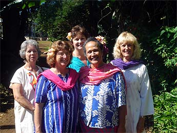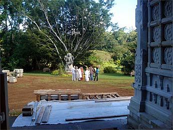 Twenty dancers from Hawaii are taking a journey to India in January. They are all part of the hula halau of Roselle Bailey, second from the right. Five of them came today to connect with the temple, write prayers for their journey and visit Iraivan.