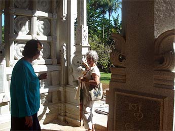 Roselle explores the stone ball in the lion's mouth.