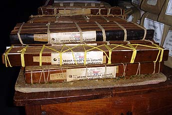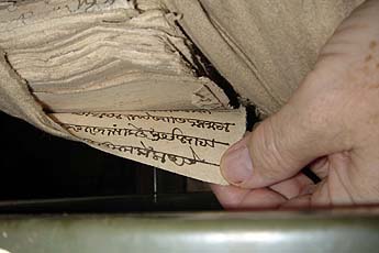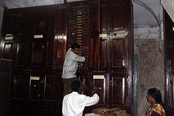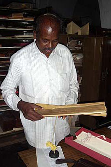 We're back into the Saraswati Mahal Library, some of which you've seen already. Here Dr. Sabharatanam is checking their catalog for useful manuscripts.