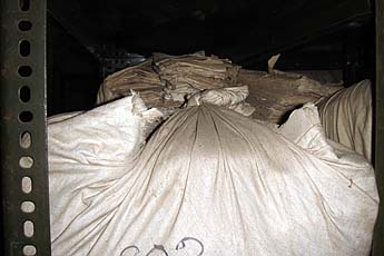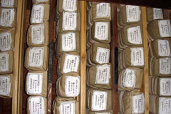 An assistant is sent to retrieve a bundle from these tall cabinets. It was no easy task sorting through the bundles on each shelf looking for the right one.