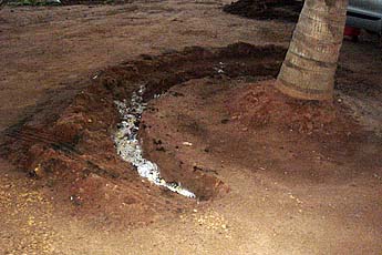 We spotted this method of fertilizing a coconut tree at the Ideal Resort--they dig a trench half way around each tree and about 8 inches deep, put in fertilizer and then re-cover.