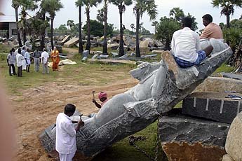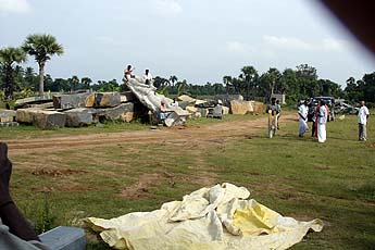The Hanuman is propped up against a pile of stones and has four silpis working on it at a time.