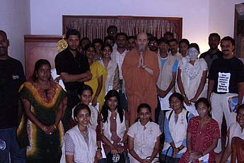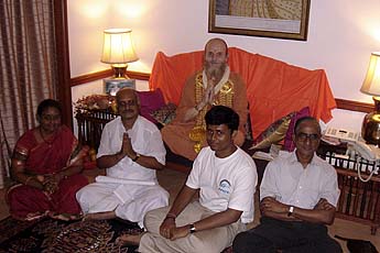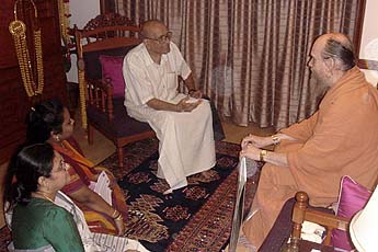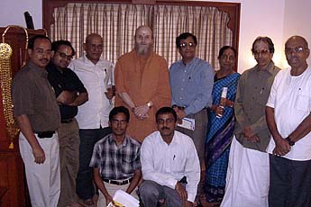This is the entire Yuva Kendra of Chennai Chinmaya Mission, some 35 youth let by Prasanna. We had an 1.5 hour discussion on the marvelous programs of the Chinmaya Mission. Bodhinatha remarked that the Mission had achieved "critical mass" with regard to their youth programs. Their two-year service program for youth was possible because they had enough centers and teachers. The youth would go for four to five months training, then serve in one center or another for the next 15 or 16 months. One after another testified how the experience had completely changed their lives, making them aware of themselves as a spiritual being with a spiritual purpose. Asked if they had come into the mission because of their parents, they replied, "It was the other way around," meaning that their parents joined the mission after the youth became involved. It was a very encouraging meeting, showing that the Hindu youth of India have the potential to develop into a powerful spiritual force in their own right.
