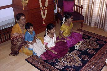 Gunalan family arrives. Here the two older daughters sing for Bodhinatha.