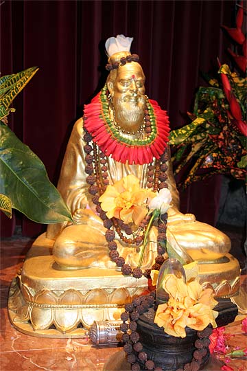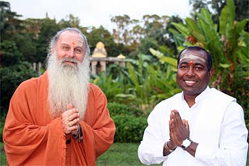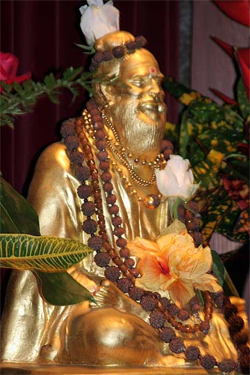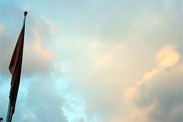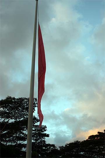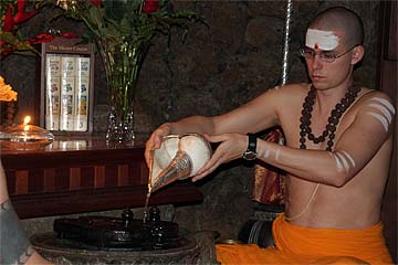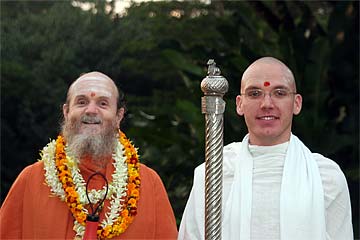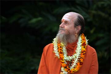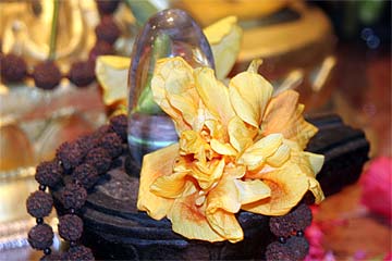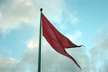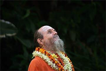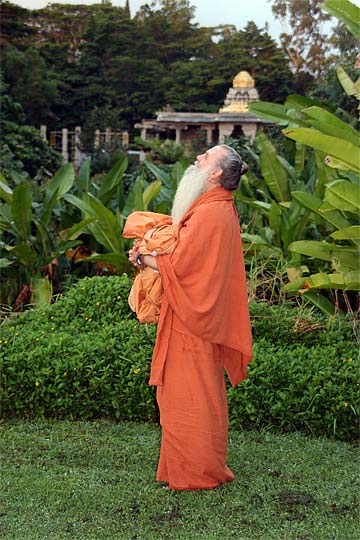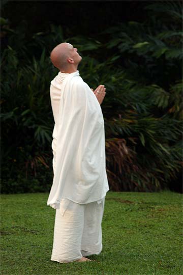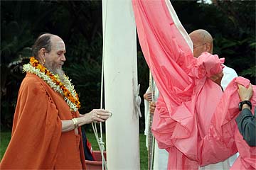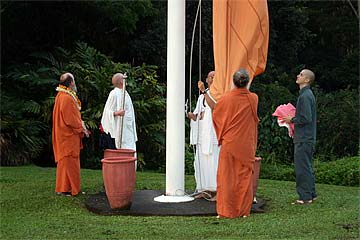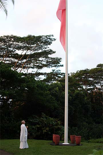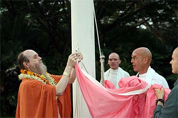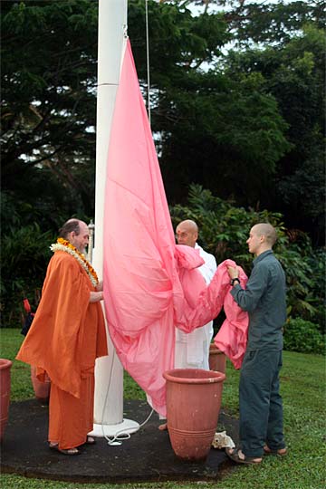 Bodhinatha looks up at the newly raised coral pink flag that marks the beginning of the Moksha Ritau.