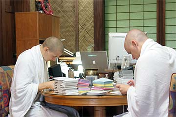 It is "all hands on deck" in the Ekadanta Kulam where our task forcers have been recruited to work on the year-end mailing, which includes membership cards for 2007, CDs and other "jewels" for all the sishya around the world. That's Tandavan and Teja pushing the project forward this morning.