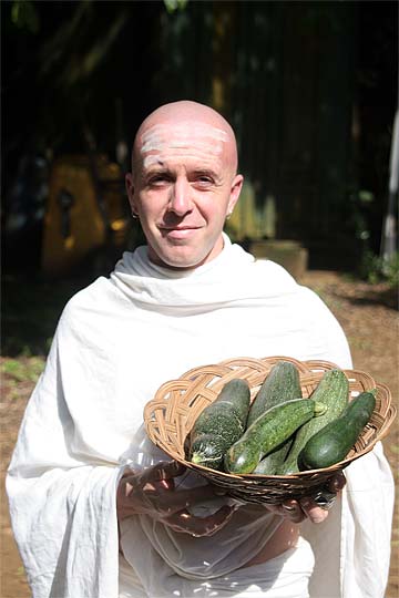But there are other issues. One of the challenges has been to grow any kind of squash at the Aadheenam, because they are usually bitten by fruit flies. Sadhaka Nilakantha is the lead man on the food growing and he tried growing zucchini squash... Success!