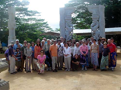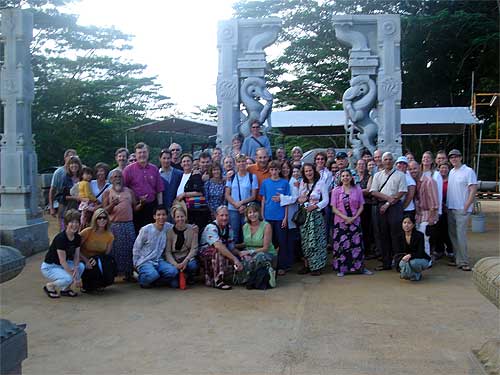 A large happy group arrived for the 9 a.m. tour. Here they are in front of the Yallis at the Iraivan Temple. Their first visit to a Hindu temple for most of them.