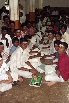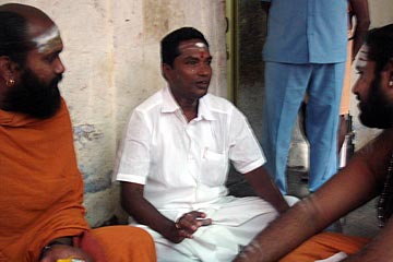 Yoginathaswami sitting with Mr. Muthumanikam, our host in Palani, and one of the priests at Palani. Muthumanikam is the chairman of the endowment board for Palani temple and principal of the nagaswaram and tavil school connected to the temple. He is well respected by the temple staff and gave us unprecedented access to the temple, pujas, etc., bypassing throngs of devotees even at extremely busy times. The Ayyappan devotees are on their pilgrimage now, so the popular temples like Palani are packed with the black-clad, excited, uncontrollable yatris.