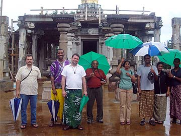 Light showers accompanied our little group to the Iraivan Temple site this morning. From left to right, Blaine Schafer from Kauai who plans to go on the 2008 Innersearch Pilgrimage to India, David and Mark from Sacramento, California, Subba Rao with his family, Kusuma, Rajesh Vijaya Lakshmi and the Raman family all from Wisconsin.