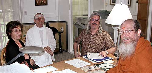 Several days ago, Santosh and Karuna Krinsky visited our monastery for the first time. We have known them for 15 years, since they began advertising in Hinduism Today. They are the founders of the famous and highly successful Lotus Press which publishes a great diversity of books on Eastern spirituality. Here, they are meeting with Shanmuganathaswami and Sadhaka Jothinatha, sharing some spiritual matters and, yes, "talking shop," too, as book publishing and distribution is an area we fondly share together. We were impressed with the Krinsky's depth of spirituality and vision and are looking to working with them more closely henceforth.