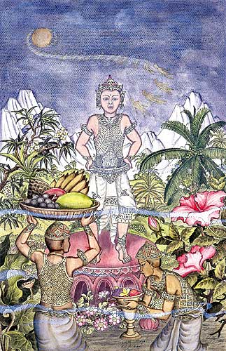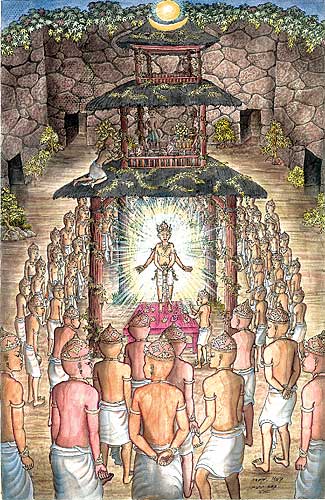 "First Temples" depicts the living appearance of Mahadevas on the platform, communicating directly with devotees.