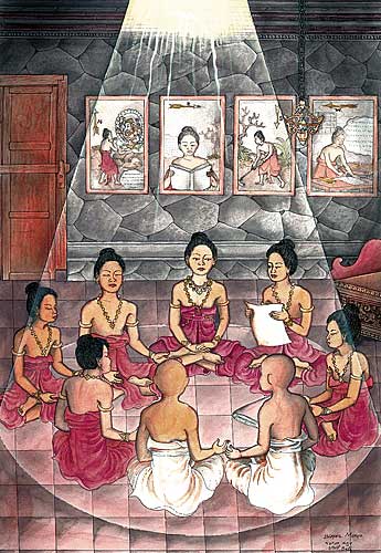 "Senior Minority Group" Depicts the ancient system of administration of monasteries by the senior most residents who gather to listen to the guidance from the Guru's secretary and to report their observations on monastic life back to the Guru.