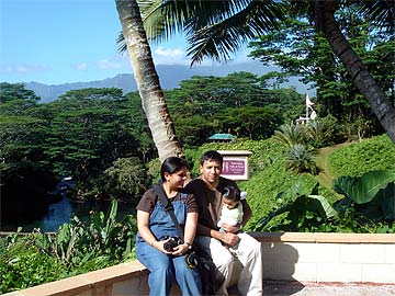 Here are Milin and Bijal Shah from Atlanta with 1-year-old daughter Aryana resting high above the Nani Kaua Pond and waterfalls. One can see Mt. Waialeale in the background and to the right the Iraivan Temple.