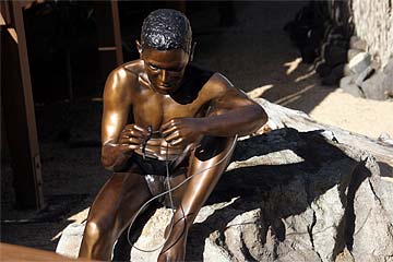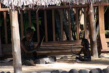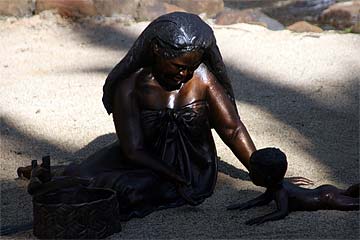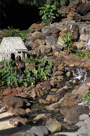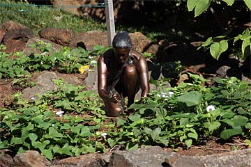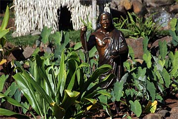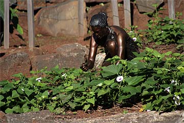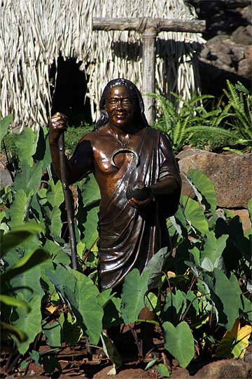 Marvelous bronze statues have been created and placed among native plants. Here a Hawaiian women is working in a sweet-potatoe patch.