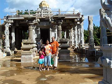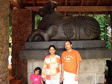 Karthik, Preeti and Samika outside Kadavul Hindu Temple beside "Nandi."