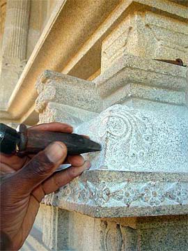 Here is one of our famous stone carvers, Rajendran, creatively working on corner Kolum designs with artful dedication. . .