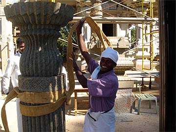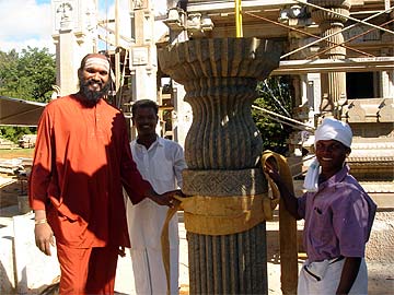 Siva Yoginathaswami with two of our always cheerful Silpis preparing to lift the first pillar by forklift.