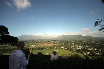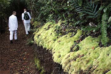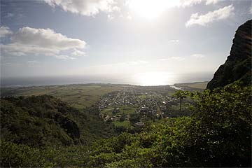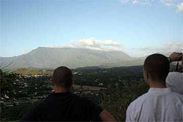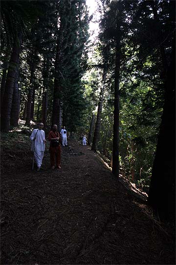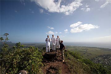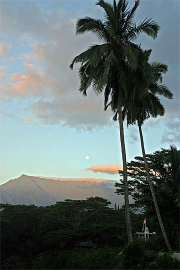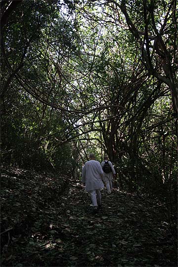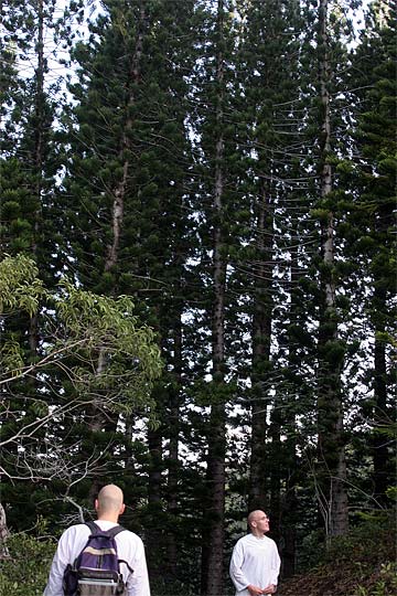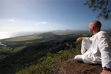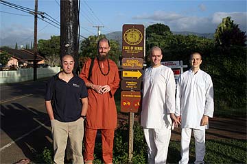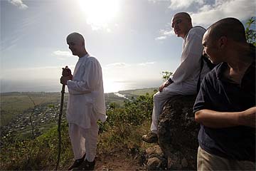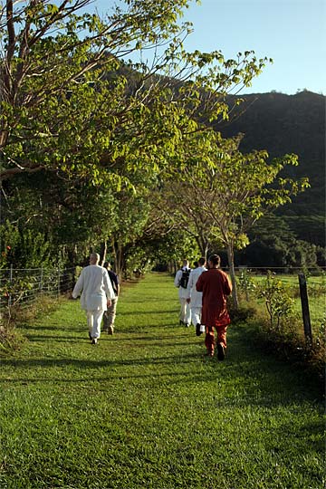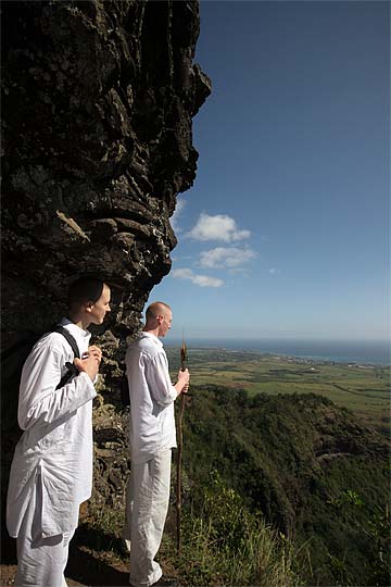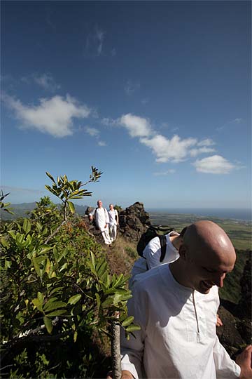 This photo is from yesterday morning, the third day of our retreat.. the Thai Pusam full moon is just setting over the mountain and a group of young monks and taskforcers set off for one of Kauai's great hikes. In fact it is only a five minute drive from the Aadheenam to enter a mini-wonderland that takes you up Kuamoo-NouNou trail for some spectacular views of East Kauai. We will let the pictures tell the story.