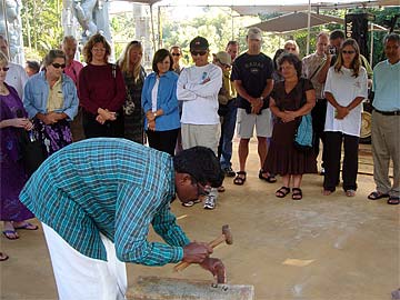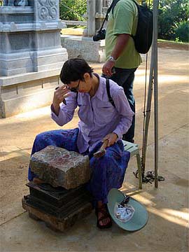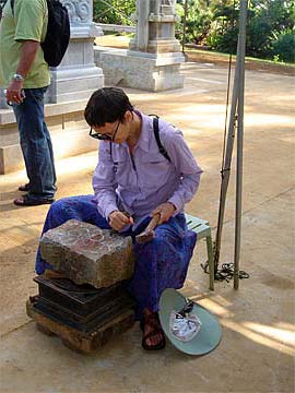 Rajendran patiently demonstrates the ancient art of stone-carving.