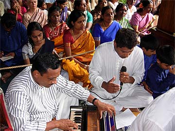 Singers lead devotional songs that are repeated in chorus by all those present...