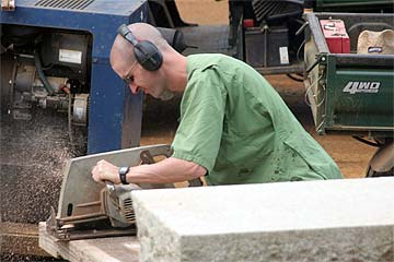 Rajendran and Manikandan are busy preparing the concrete surface for the two remaining Bhadra pillars, which are the last of the pillars in the temple. Breaking concrete by hand -- now that's hard work! Yet, always with a smile on his face.
