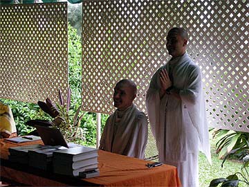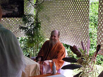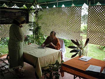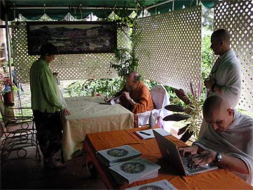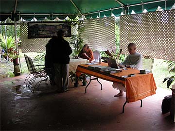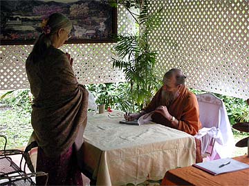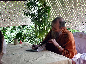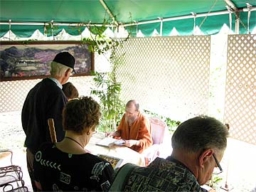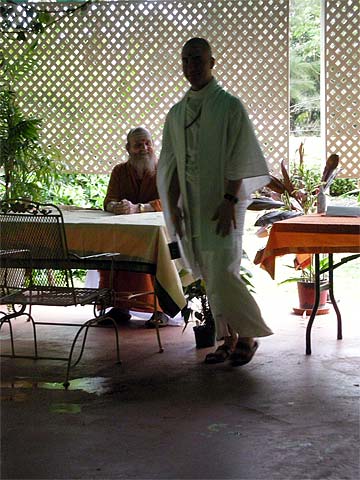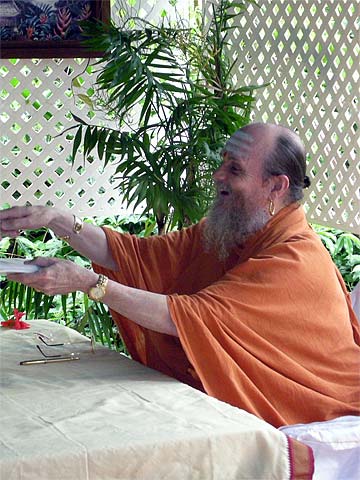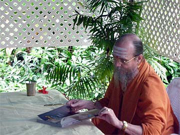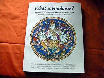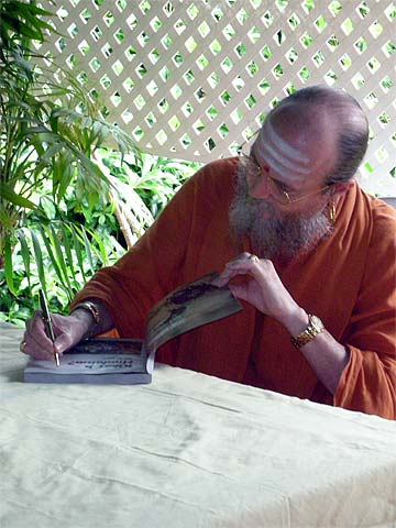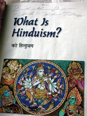 Our first guest takes his copy of "What Is Hinduism?" to Bodhinatha.