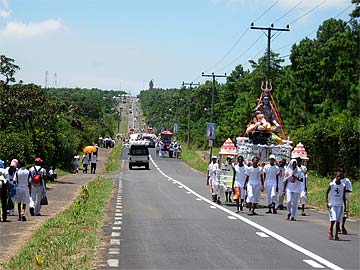 Many pilgrims, especially those of the north Indian origin walk down to their localities carrying wooden frames called "kanwars" as a tapas or penance.