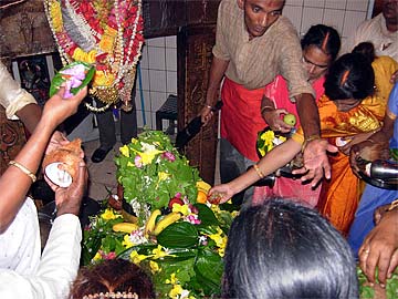 At peak times, devotees have to stand for hours in queues to get inside one of the Siva temples on the crater edge to worship the Siva lingum. Here is inside one of them. The Sivalingam (centre) is covered by bilva leaves brought as offerings....