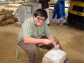 This young man was so impressed with the Shilpi's work that he spent about 15 minutes concentrating on carving 'that flower' with some success!!!
