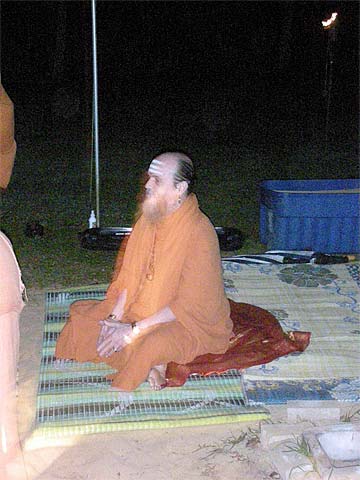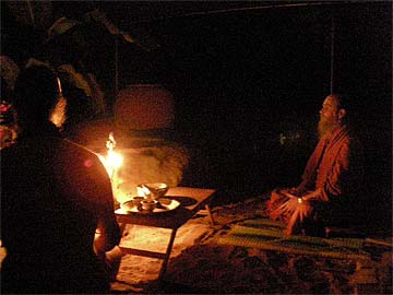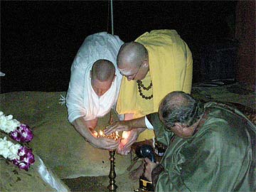Today was the auspicious anniversary of Gurudeva's vision of Lord Siva sitting as Dakshinamurti on the sacred lingam on San Marga. To commemorate the occasion a special puja was performed in the early morning before dawn at the Svayambhu Siva Lingam, which Gurudeva discovered a few hours after the vision. Lighting lamps in the windy morning can be a challenge.