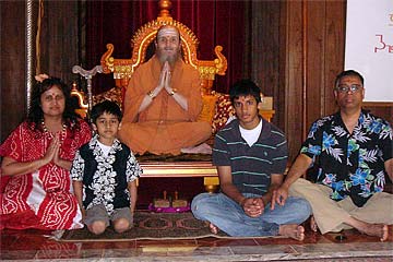 Punam Misal and family from Seattle. She follows the Self-Realization Fellowship (Swami Yogananda) and asked Bodhinatha why we include temple worship in our path, since Self-Realization Fellowship teaches that meditation is the highest path and temple worship is not necessary to realize God. So, Bodhinatha gave a simple answer since there wasn't much time. He explained that while meditation is indeed the "highest" path in a sense, it is very challenging to meditate for most people, and temple worship softens us and helps get us in the right mood and frame of mind for meditation.