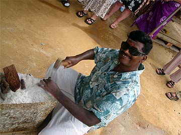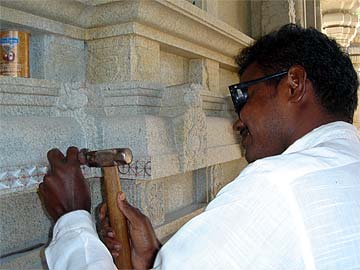 The tradition of carving in India is regarded differently depending on what it is one is carving. Temple carvers hold a higher respect among Indian society than craftsman who make tools or everyday items. While three of Kaua'i's visiting artists came to the profession because their fathers or grandfathers also did the work, the other three came to it on their own, out of interest and desire. The training of the craft costs time and determination -- it takes a minimum of six years to begin a professional career as a carver. Working one's way through apprenticeship in tools and labor eventually allows the aspiring carver time to practice on scraps lying about at the work site. Practicing chipping away at solid stone is done over lunch breaks and free time. Once the apprentice feels they are able to make rough forms, they approach the construction coordinator out of their own volition to apply for a position. Several years are spent learning how to smooth surfaces and carve general pictorial forms, yet the exquisite details of Hindu temples are left only to the very experienced master carvers, called Silpis.