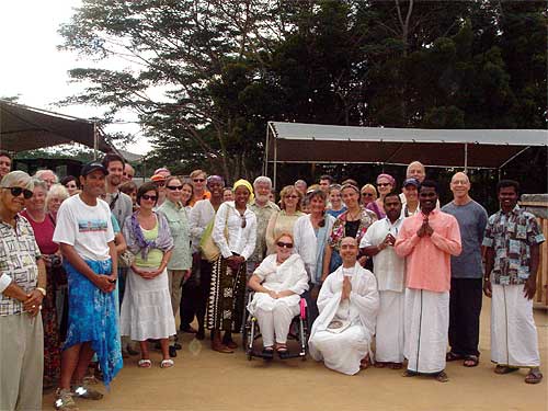 The second group of visitors pose with their ever-positive, proficient and patient tour guide, Sadhaka Satyanatha, as well as three of the shilpis, Kumar, Pandi and Rajendran (right).