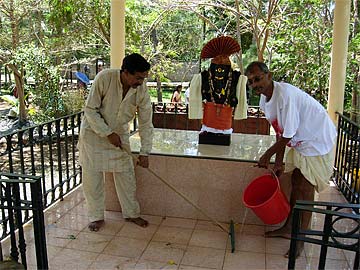 The ceremony over it is time for cleaning up the Mandapam and the small Ganapati Shrine. Here are Ananda and Bala at the small shrine lovingly doing their seva.