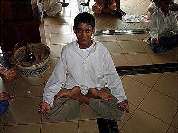 The lotus posture or padmasana.... Young Mevin sometimes fidgeting in class is learning to stay still and calm.