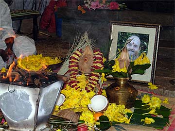 The photo of Bodhinatha is placed near the kumbhas and the priest chants special mantras for the family Guru.