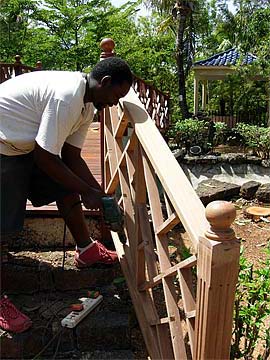 In the meantime our hired workers are about to complete works at the new Ganesha Bridge. The last wooden railings are being fixed and the weather is favorable for varnishing.
