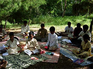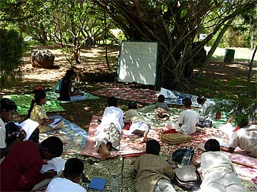Due to noise of the workers at the new Bridge, our youth are not having their SHR class at the Ganesha Mandapam as usual today. They are gathering at a quiet place under a shady banyan tree on the property. Looks like an ancient classroom in India.