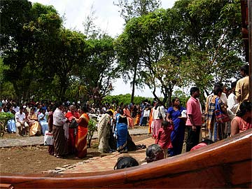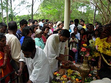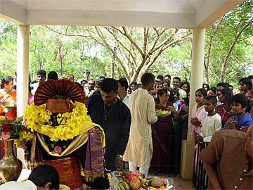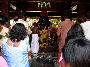 A large group of devotees are worshipping at the small Ganesha shrine where the coconuts are broken.