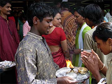 Members and students are there to give a helping hand, taking the trays from devotees and placing the offerings at the Feet of Lord Ganapati.