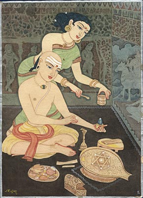 Artwork from Dancing with Siva by S. Rajam. Atmartha Sivalinga puja in the home shrine.