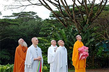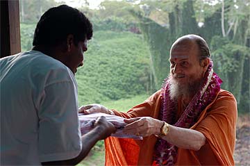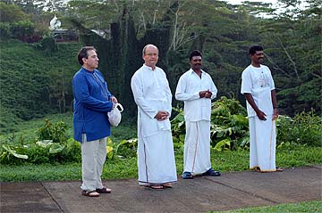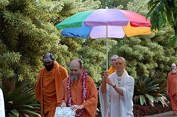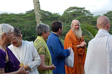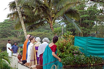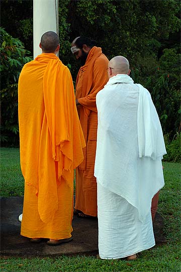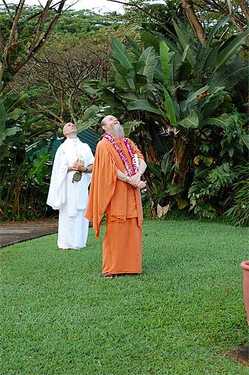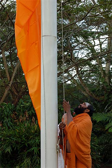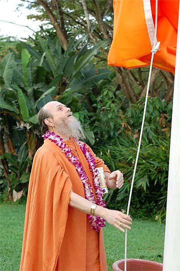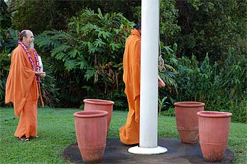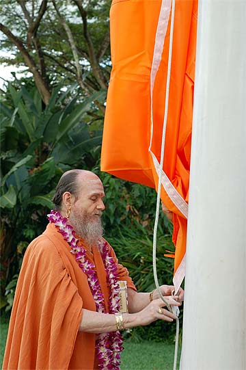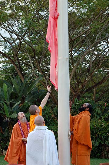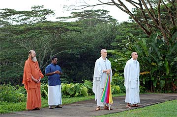 Nartana Ritau, the season of Dancing with Siva, begins on Hindu New Year. This is the period of creation, the warm season, from mid-April through mid-August. The teaching is Dancing with Siva: Hinduism's Contemporary Catechism, Sivena Saha Nartanam. This foundational text is featured in all mission satsangas. The key word of this season is planning. The colors are orange, yellow-gold and all shades of green-- orange for renunciation, yellow-gold for action, and green for regeneration. High above, the main Hindu flag flies the color orange, heralding the Nartana Ritau throughout this season, symbolizing sadhana and self-control. The other colors adorn smaller flags. This is the season of giving special attention to those in the grihastha ashrama. It is a time of awakening, renewal, review. The emphasis is on seeing ahead, planning for future years. It is a time of planning retreats and other activities for youths and adults for the entire year. The practical focus is completion of unfinished projects. Secular holidays to observe among the families include Mother's Day in May, Father's Day in June and Grandparent's Day in August. The special dietary adjustments for the season come into effect and new menus are established. New clothing is issued and old garments mended. This season of harvest and new growth is also the time to review and reestablish picking and planting routines for the gardens. It is a time for ordering seeds and plants for the year, of planting trees, fragrant vines and the annual crop.