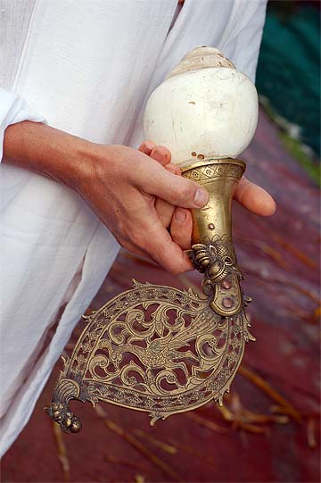 The ornate handle of the conch that is blown.