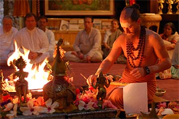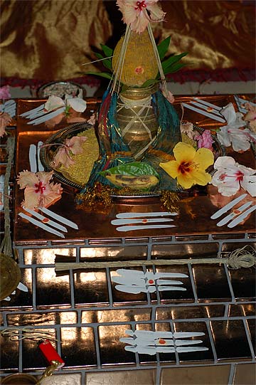 Morning homa was performed. This is the first fire ceremony in the newly built altar. On the top you can see the shiney new copper insert.