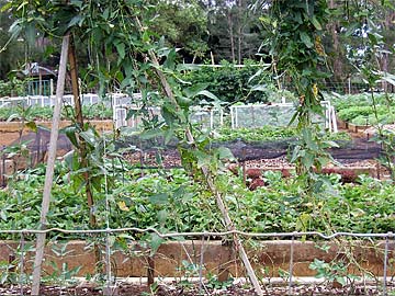 Pole beans in foreground and sweet potatoes behind .