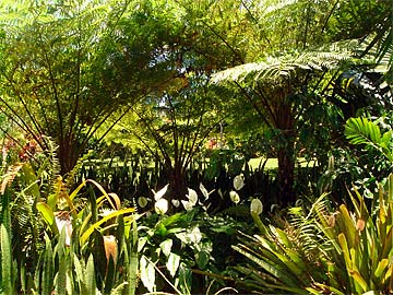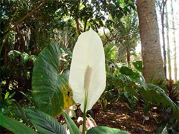 Sheltered by Australian ferns and encircled by Hawaiian cactus is a beautiful grove of white anthuriums.